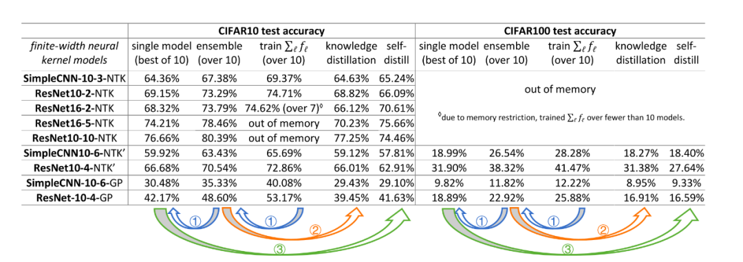 在图3中,神经正切核(NTK)模型的集成,在 CIFAR-10数据集上达到了70.54% 的准确率,但经过知识蒸馏后,它下降到了66.01% ,甚至比单个模型的66.68% 的测试准确率还要低。