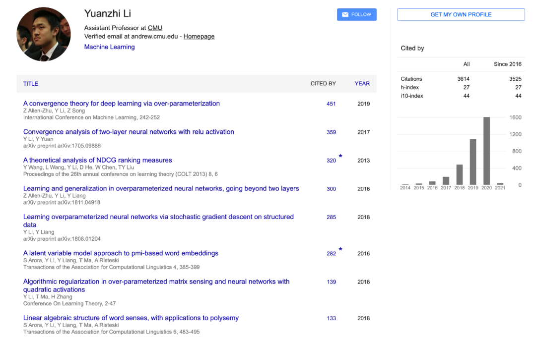 另一位作者李远志,现任美国卡内基·梅隆大学(CMU)机器学习系助理教授,也是微软研究院的访问研究员。他于2010年到2014年在清华姚班进行本科学习,于2018年在普林斯顿大学获得博士学位,在斯坦福大学做了一年博士后之后,加入CMU担任助理教授。其研究方向主要为深度学习的基础理论与实践,凸优化算法与非凸优化算法设计,数据处理算法分析等。