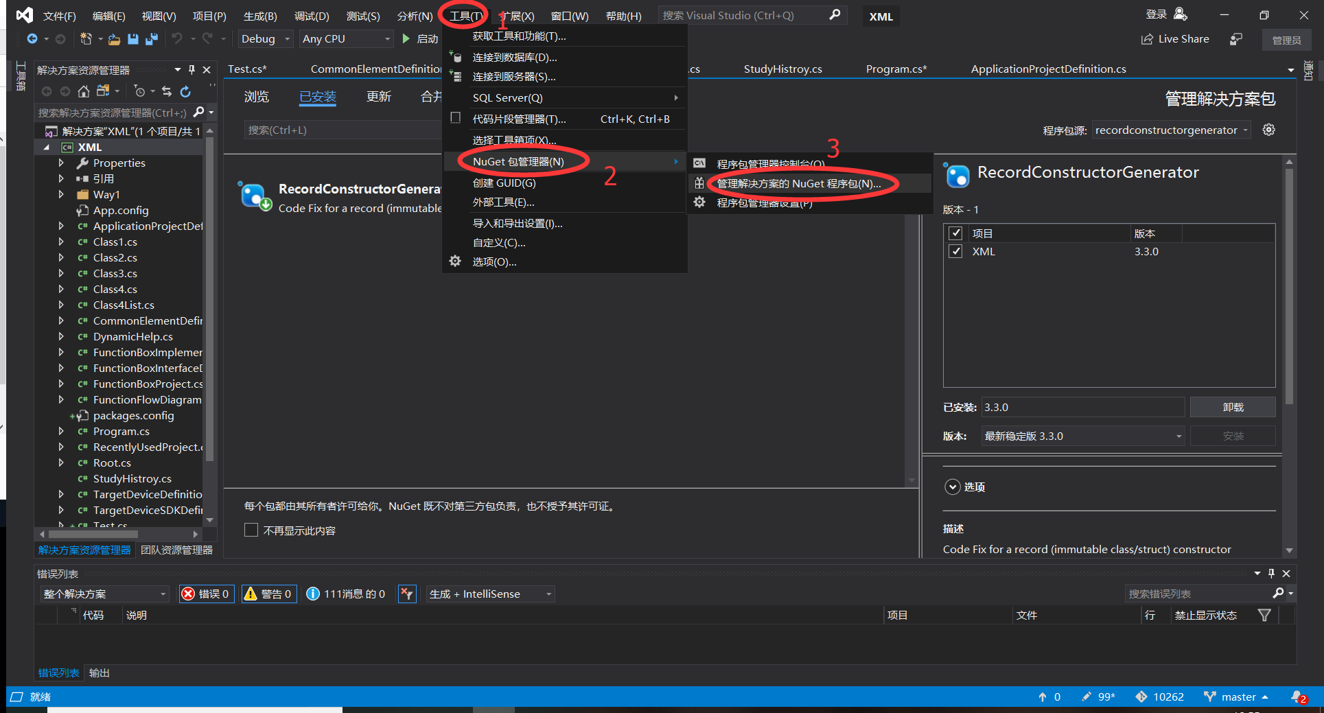 1、打开VS: Tools->NuGet Package Manager->Manager NuGet Packages for Solution…
