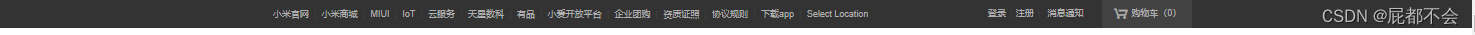 </head><body><header><div><ul class="left"><li>小米官网</li><span>|</span><li>小米商城</li><span>|</span><li>MIUI</li><span>|</span><li>lot</li><span>|</span><li>云服务</li><span>|</span><li>天星数科</li><span>|</span><li>有品</li><span>|</span><li>小爱开发平台</li><span>|</span><li>企业团购</li><span>|</span><li>资质证照</li><span>|</span><li>协议规则</li><span>|</span><li>下载app</li><span>|</span><li>Select location</li></ul><ul class="right"><li>🛒购物车(0)</li><li>消息通知</li><span>|</span><li>注册</li><span>|</span><li>登录</li></ul></div></header>