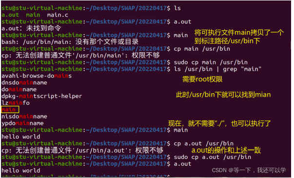 可以将我们刚才生成的main和a.out放到/usr/bin里面,则这时 系统就可以找到了,就不会报错了,就可以像pwd,ls这些命令一样, 不需要路径也可以执行了。