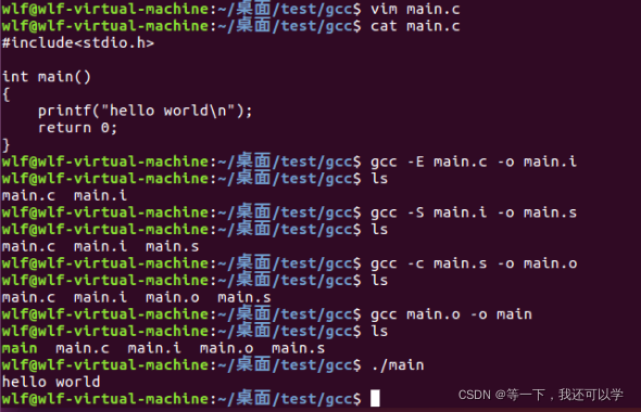 命令:$gcc -E main.c -o main.i (-E只能进行预编译)。
