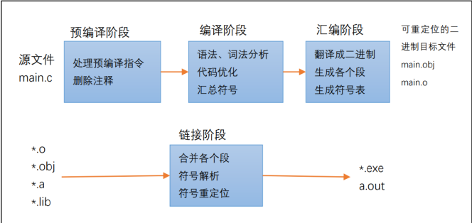 为四个过程:预处理(预编译),编译,汇编,链接。(详细内容请看 6.编译和链接)