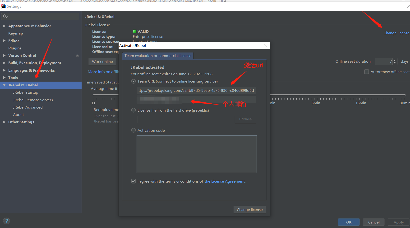 激活方式:填写jrebel的激活url和个人邮箱即可。步骤:settings-》JRebel-》点击 Change license,填写完后点击下面的 Change license 按钮。