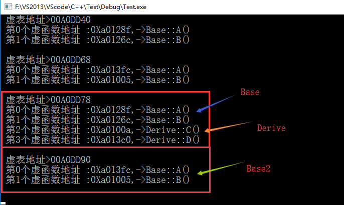 最后在看看多继承下覆盖后的虚函数表,结合之前示例实现此过程就很容易,不再贴代码直接运行出结果:
