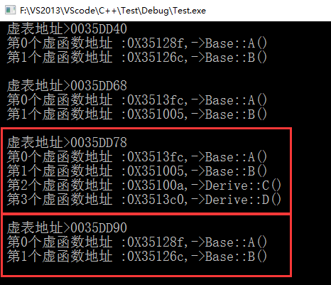 }int main(){Base b1;Derive d1;pVtable* vTableb = (pVtable*)(*(int*)&b1);PrintVTable(vTableb);pVtable* vTabled = (pVtable*)(*(int*)&d1);PrintVTable(vTabled);return 0;