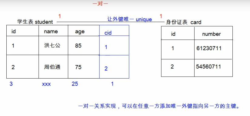 3.一对一:如人和身份证 一对一关系的实现可以在任意一方添加唯一外键指向另一方的主键。