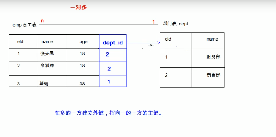 1.一对多(多对一):如部门和员工 实现方式:在多的一方建立外键,指向一的一方的主键。