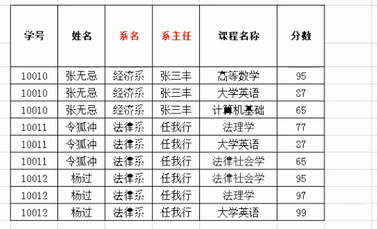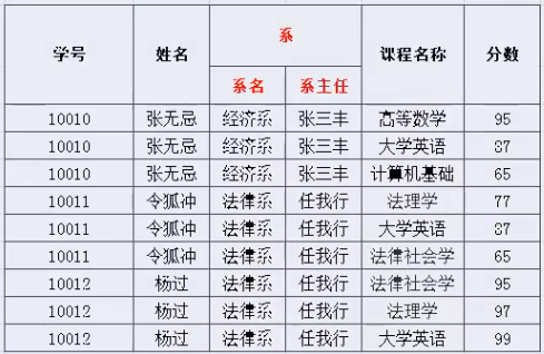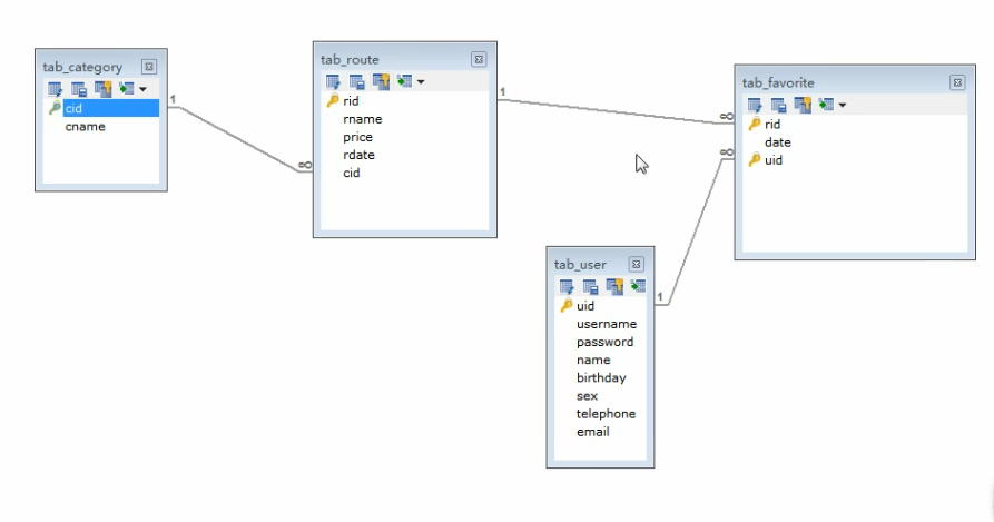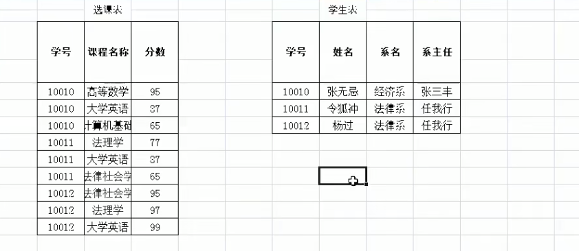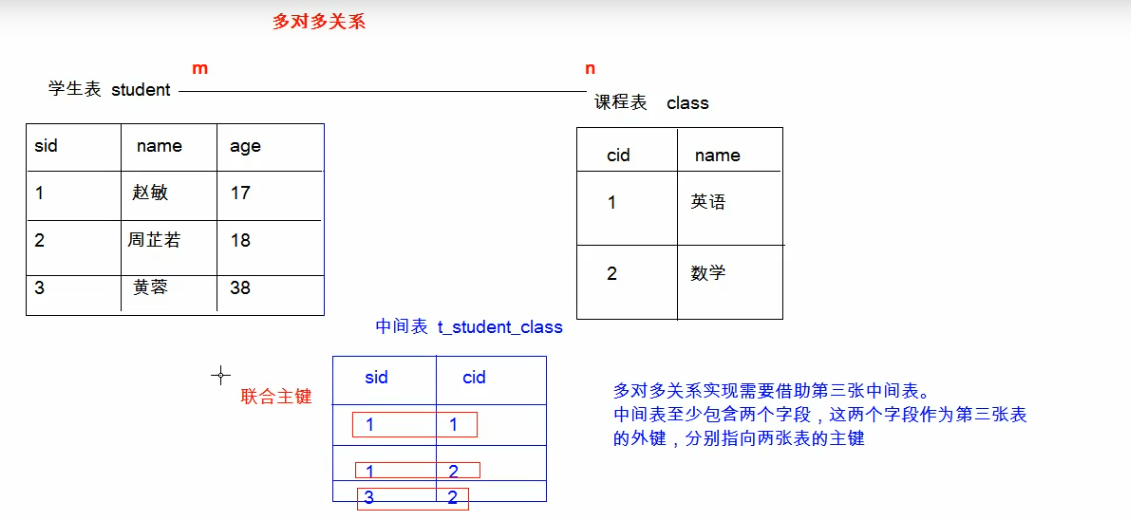 2.多对多:如学生和课程,可以利用中间表sid和cid作为列名进行匹配(中间表至少有两个字段,这两个字段分别作为第三张表的外键,分别指向 两张表的主键)