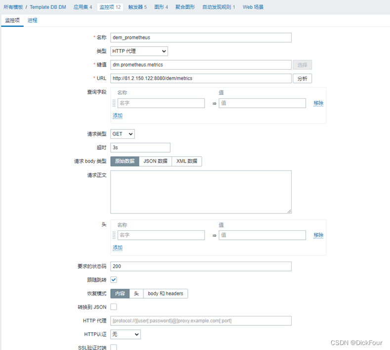 (2)在zabbix端创建http监控项,地址为DEM中promethus接口地址:http://<dem_ip>:<dem_port>/dem/metrics