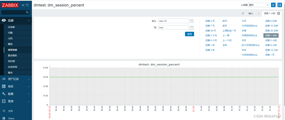 然后通过浏览器访问ZABBIX WEB端,添加监控项(可以在模板中添加): 名称自定义,类型选择ZABBIX客户端,键值输入之前conf文件中设置的dm.sessionnum