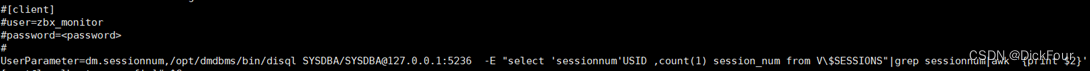 在zabbix_agentd.d(默认为/etc/zabbix/zabbix_agentd.d可在zabbix_agentd.conf里配置)下,新增dm_session.conf,添加UserParameter参数例如UserParameter=dm.sessionnum,/opt/dmdbms/bin/disql SYSDBA/SYSDBA@127.0.0.1:5236 -E "select 'sessionnum'USID ,count(1) session_num from V\$SESSIONS"|grep sessionnum|awk '{print $2}'