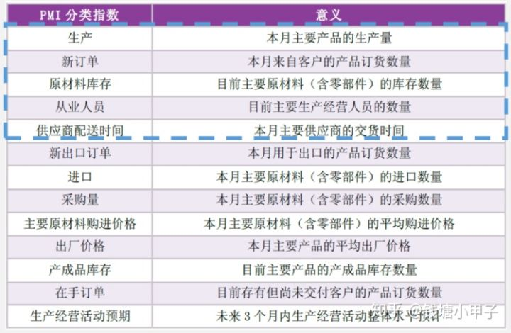 虽然制造业PMI的问卷调查有这么多项目,但是最后在加权的时候其实只使用了蓝色虚线框圈起来的四个。