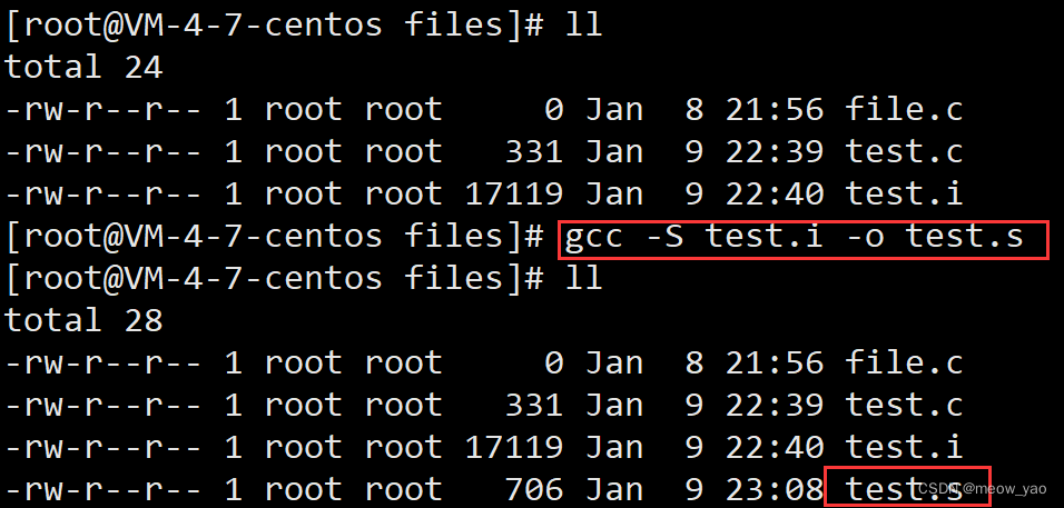 3.输入命令,进行文件的编译操作,生成汇编文件test.s