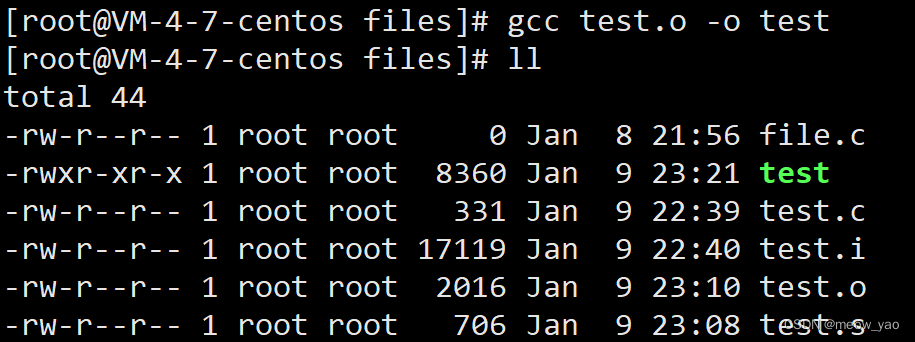 5. 输入命令,将二进制文件和库文件进行合并,生成可执行文件test
