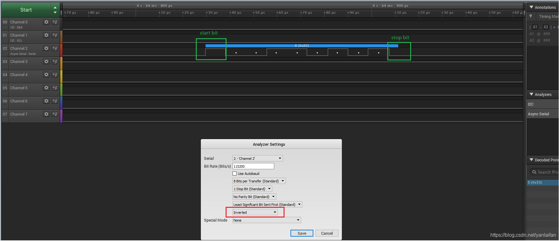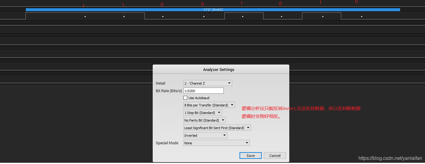1、DUT已经配置为TX invertion,逻辑分析仪也调整好协议格式(invertion)
