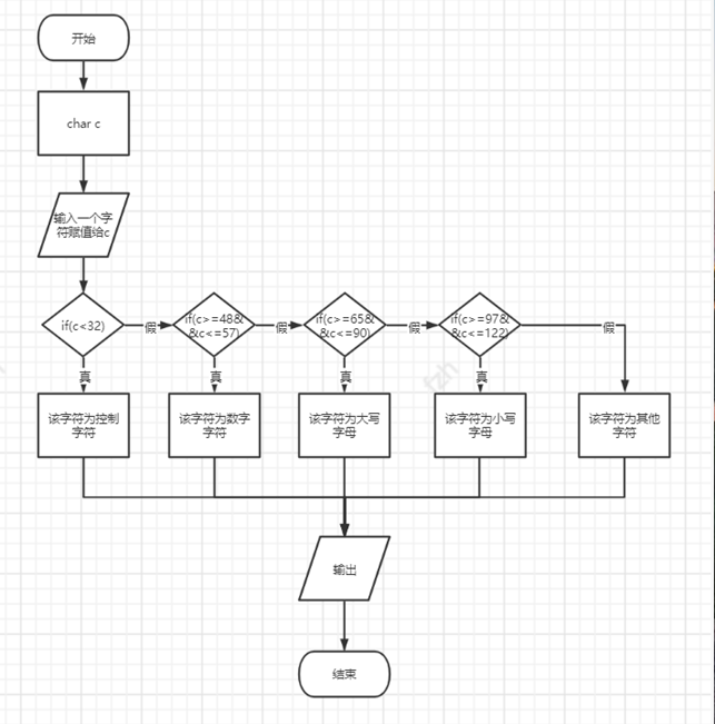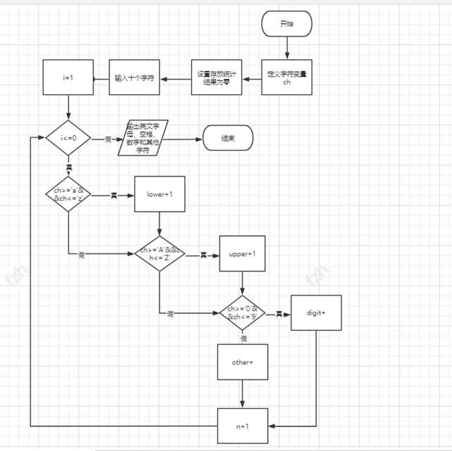 - 判定ch是否为大写英文字母,是则upper+1,否则转第⑧步;