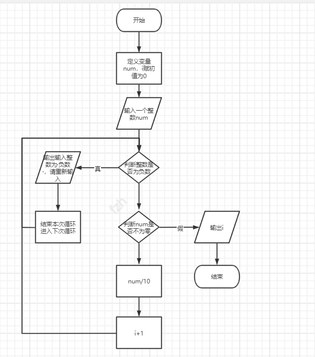 - 判断num是否不为零,是则num/10,i+1,然后转第③步,否则转第⑤步;