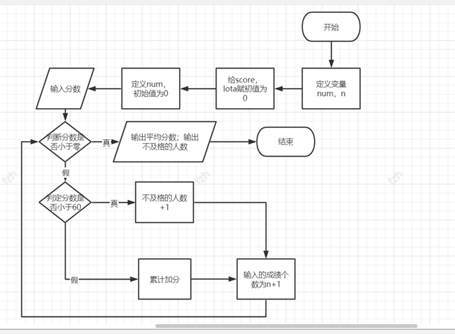 - 判定分数是否小于60,小于则num+1,否则转第⑦步;