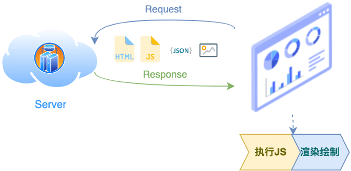 基于现代Web前端框架的应用,其原理是通过浏览器向服务器发送网络请求,获取必要的index.html和打包好的JS、CSS等资源,在浏览器内执行JS,动态获取数据并渲染页面,从而将结果呈现给用户。