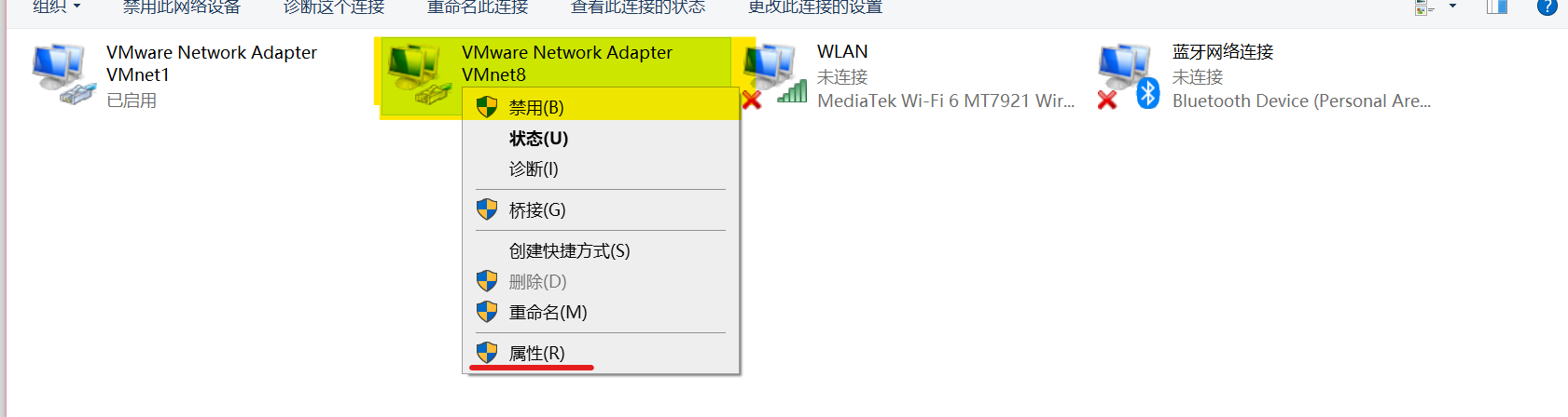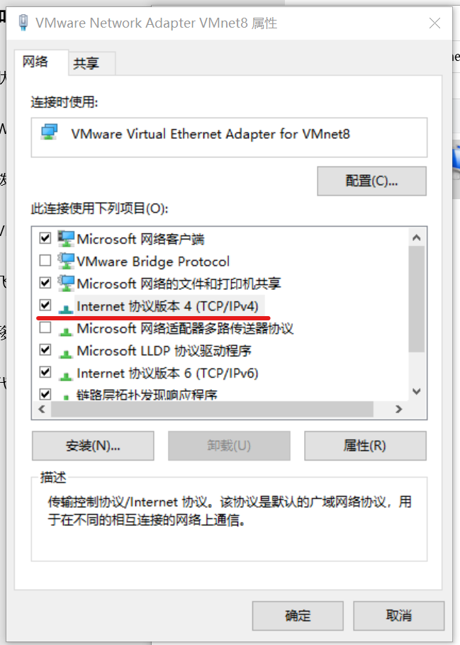 右键“网络连接”图标→打开“网络和Internet”设置→更改适配器选项→右键图中标记的“VMnet8”→属性→双击“Internet协议版本4”→设置固定ip