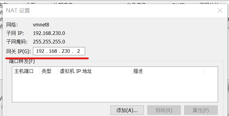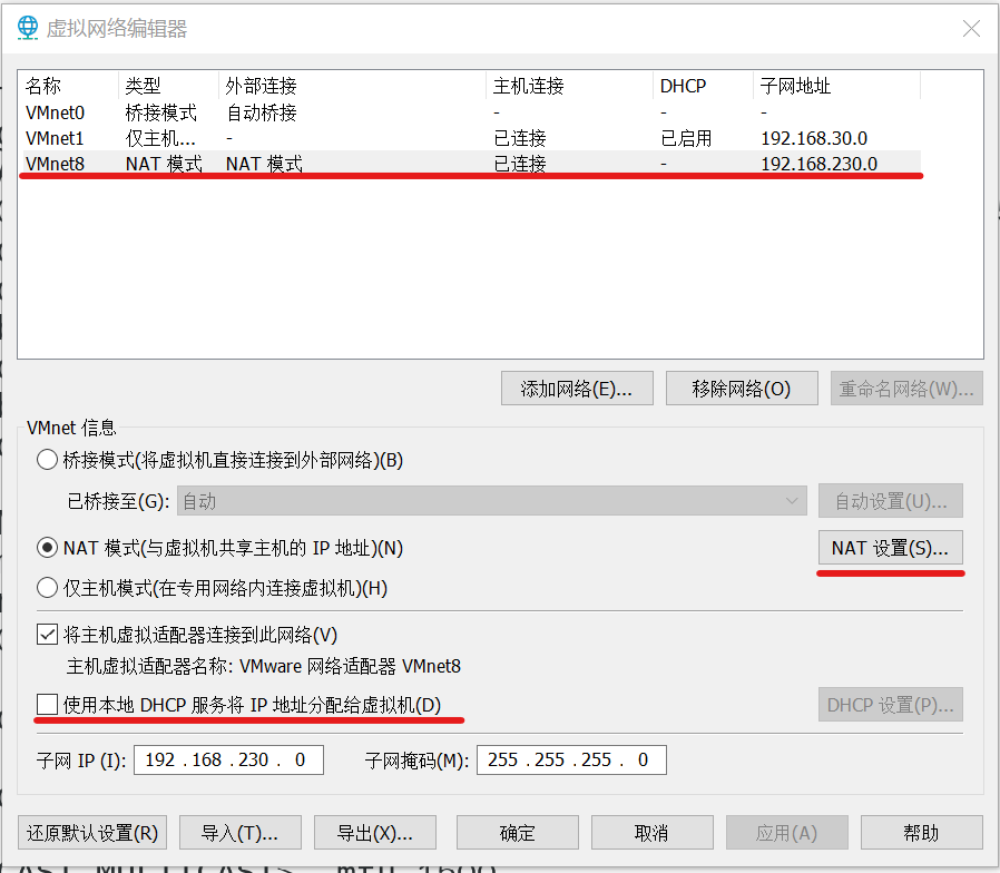 编辑→虚拟网络编辑器→点击“Vmnet8 NAT模式”→取消勾选“使用本地DHCP服务将IP地址分配给虚拟机”→NAT设置→记住网关IP