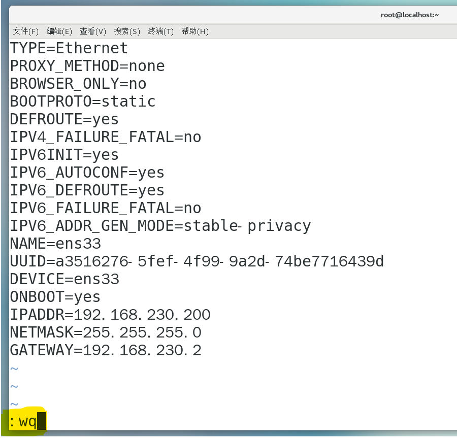 全部修改完成后,按一下“esc”进入末行模式,输入“:wq”,最后回车,需注意!!这里是冒号wq,回车后就会返回到命令行。