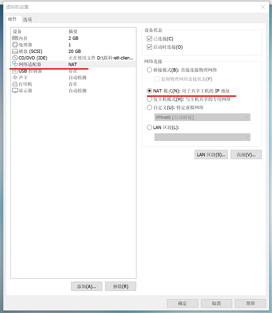 1.先查看一下虚拟机的网络连接模式,并把网络连接模式调换成NAT模式。