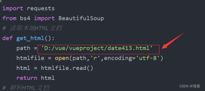def get_html():path = 'D:/vue/vueproject/date413.html'htmlfile = open(path,'r',encoding='utf-8')html = htmlfile.read()return html
