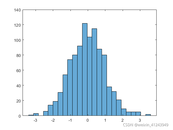生成 1,000 个随机数并创建直方图。将 bin 边界指定为向量,使宽 bin 在直方图的两边,以捕获不满足|x|<2 的离群值。第一个向量元素是第一个 bin 的左边界,而最后一个向量元素是最后一个 bin 的右边界。