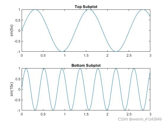 ylabel(ax1,'sin(5x)')ax2 = subplot(2,1,2); % bottom subplot