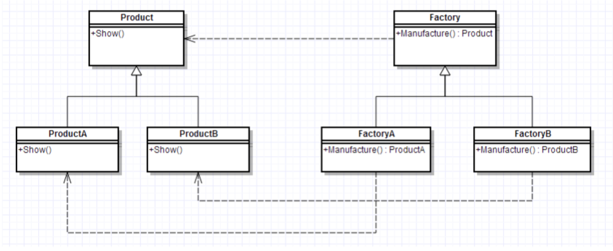 - Factory(工厂类):返回ConcreteProduct实例。