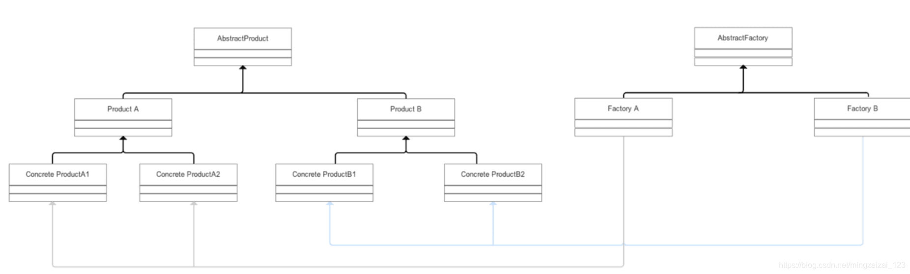 Concrete Factory 有共同的父类Abstract Factory。每个具体的Concrete Factory都可以生产多种不同产品。如Factory 1 可以生产Concrete ProductA1、Concrete Product B1,Factory 2可以生产Concrete A2、Concrete B2。