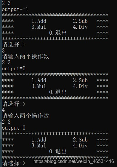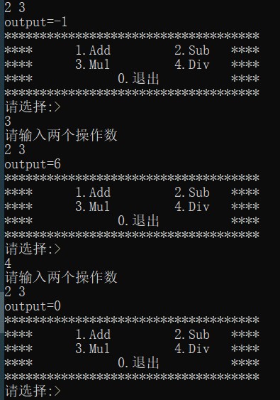 {case 1:printf("请输入两个操作数\n");scanf("%d%d", &x, &y);Add(x, y); break;case 2:printf("请输入两个操作数\n");scanf("%d%d", &x, &y);Sub(x, y);break;case 3:printf("请输入两个操作数\n");scanf("%d%d", &x, &y);Mul(x, y);break;case 4:printf("请输入两个操作数\n");scanf("%d%d", &x, &y);Div(x, y);break;case 0:printf("退出程序\n");break;default:printf("输入错误\n");break;