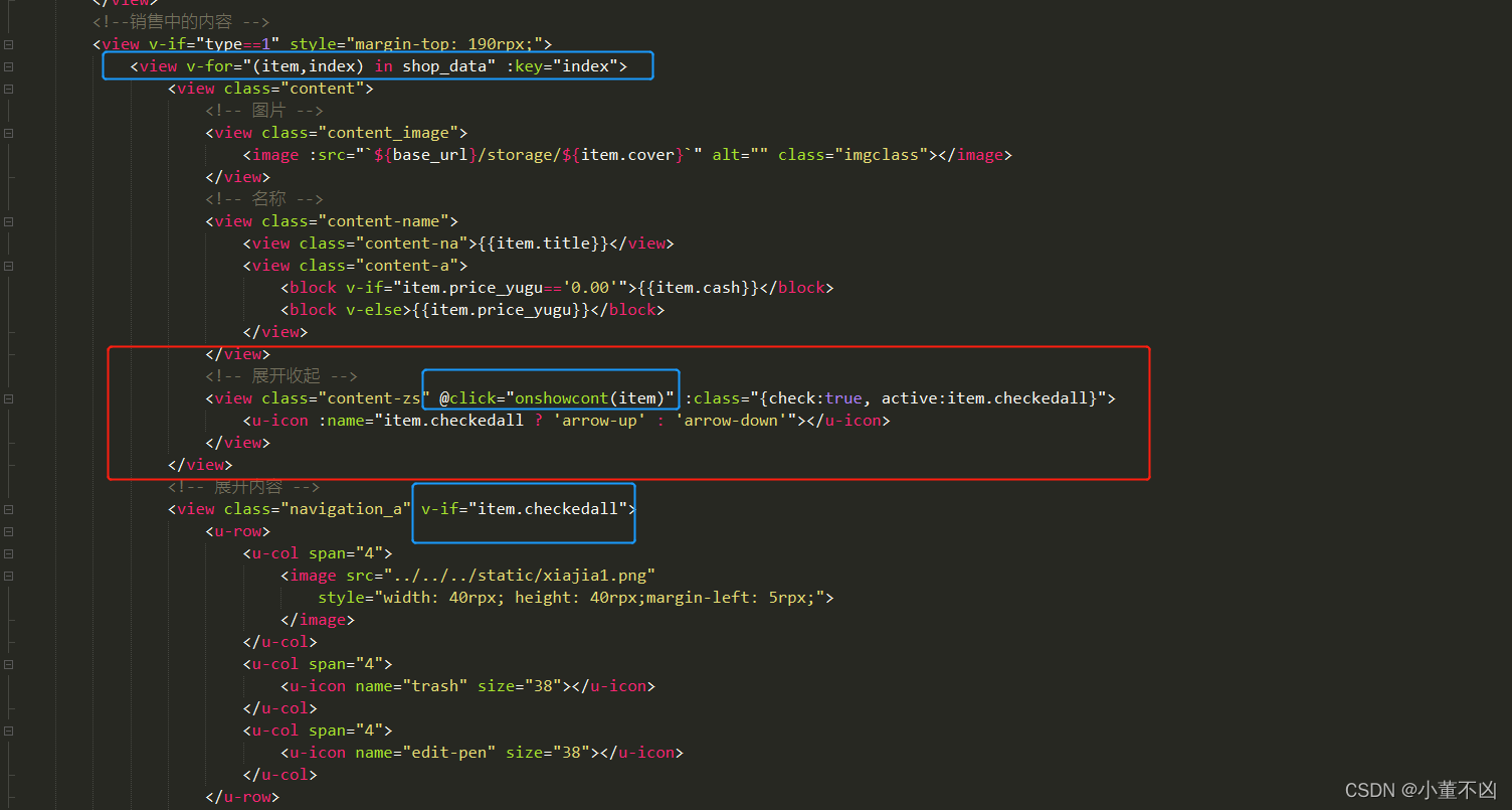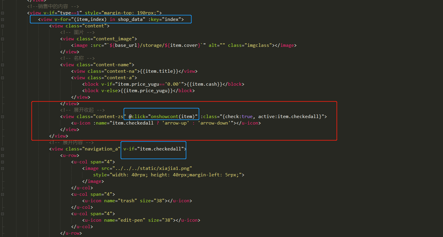 1.代码中写出样式,展开的内容用if绑定上checkedall