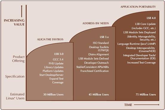 LSB 4.0 将在 2008 年发布,它将实现更好的二进制兼容性,并增加对 Perl、Python、LAMP、Java 等语言的标准化支持。详细路线图及各个主要版本的特性如图 3 所示: