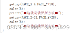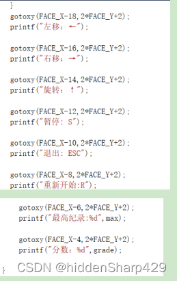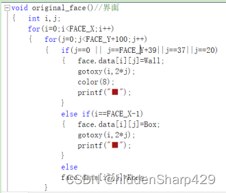 在使用定位程序的基础上,采用循环结构和printf函数来打印游戏页面的墙和按键提示。代码如下图所示