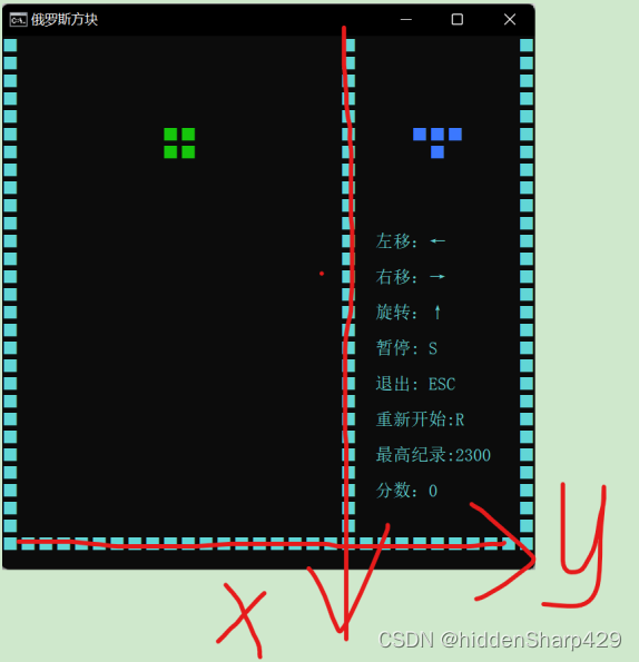 在游戏界面的x、y轴是这样的(y轴是从左到右,x轴是上到下)