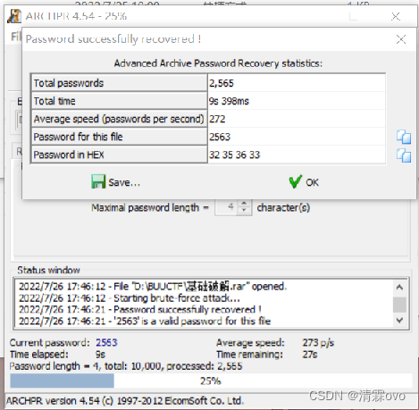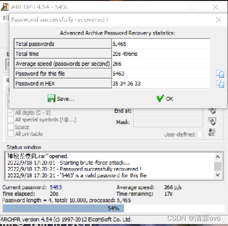rar用010打开,发现是加密,里面的txt需要四位数字密码,直接ARCHPR爆破得到密码5463
