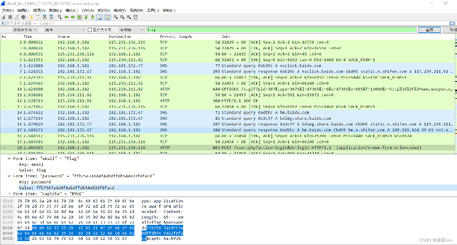 第一步直接搜索数据包,没有flag,说明想的太简单了,接着追踪了TCP流,发现内容很奇怪,是 等号结尾(当时没发现,查的答案),猜测是base64编码加密