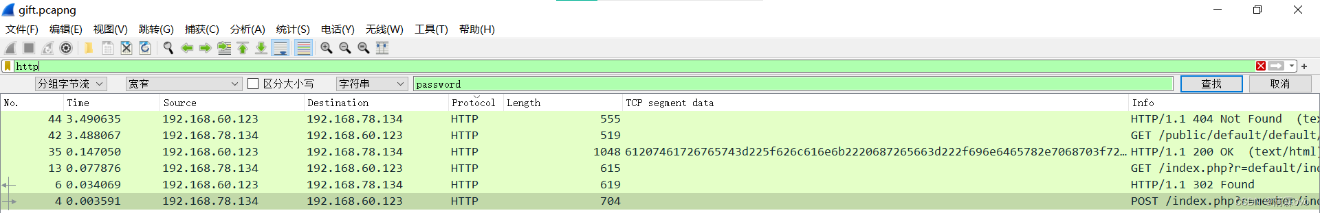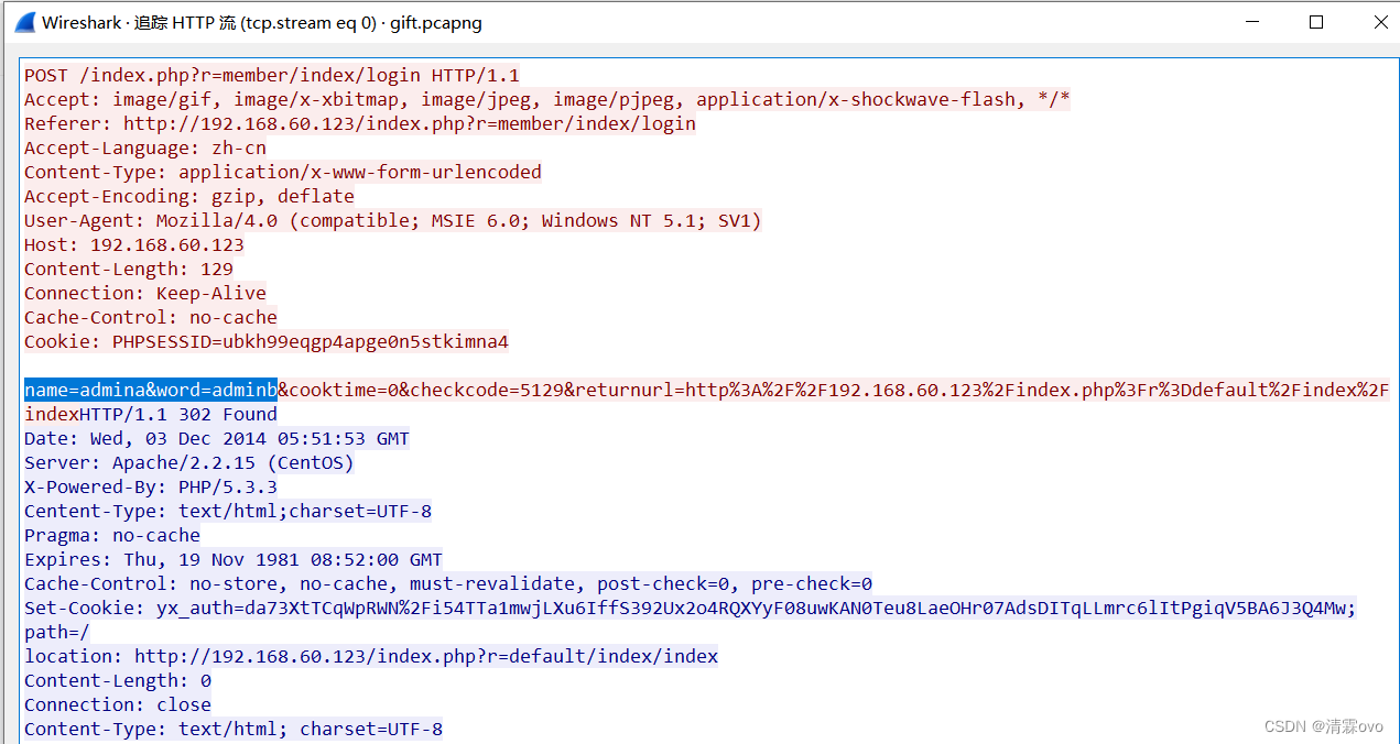 在4 0.003591 192.168.78.134 192.168.60.123 HTTP 704 POST /index.php?r=member/index/login HTTP/1.1 (application/x-www-form-urlencoded)中追踪HTTP流发现name=admina&word=adminb