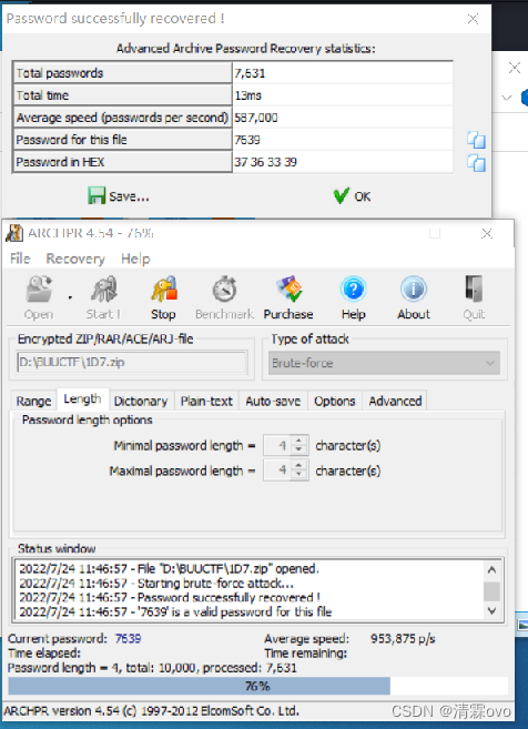 根据文件名4number的提示密码是四位数字,用ARCHPR暴力破解出7639