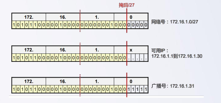 计算一下172.16.1.0/27这个子网的网络号、广播号,及可用IP地址