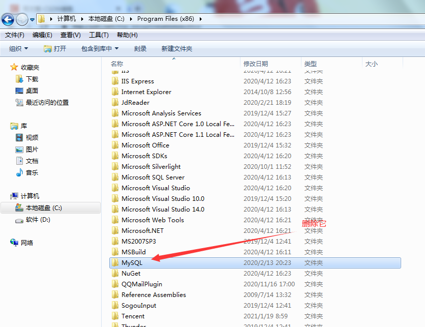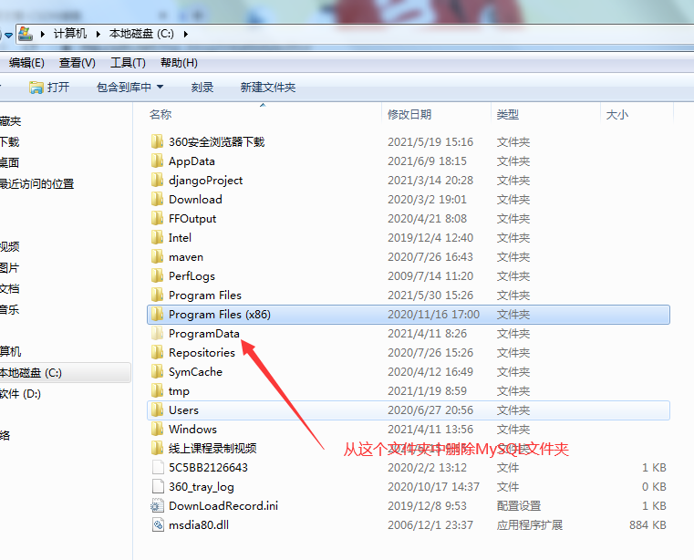 第一步:打开c盘会有一个programData的文件夹,打开后,把mysql文件删。