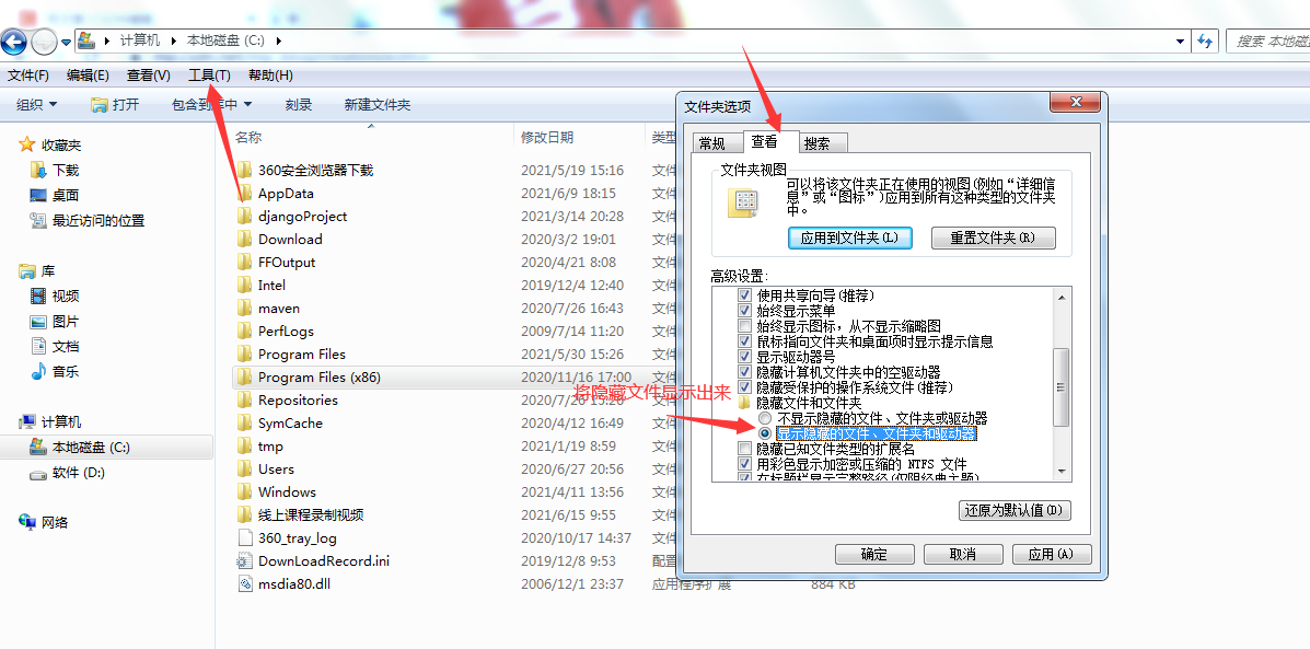 首先你在C盘中program files中是否含有mysql文件,如果有的话,删掉,然后还有一些隐藏的文件,点击工具栏中的工具à文件夹选项->查看->选中显示隐藏的文件;