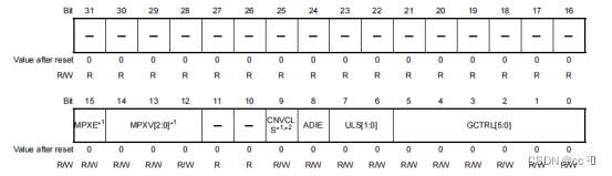 | 15 | MPXE | MPX启用 0:禁止使用MPX,A/D转换前没有插入等待。 1:允许使用MPX。MPXV[2:0]位从虚拟通道启动时ADCAnSEL0到ADCAnSEL2,等待时间为 A/D转换前插入1个A/D转换时间。 |