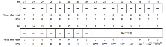 | 7 - 0 | SMPT | 这些位用于设置采样时间(循环数)。 12H: 18个周期(ADCLK = 8兆赫到32兆赫) 18H: 24个周期(ADCLK = 8兆赫到40兆赫) 禁止进行上述以外的设置。 |