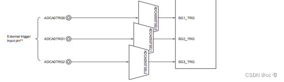 外部模拟多路复用器(MPX)可以连接到任何输入信号引脚ADCA0I0 ~ ADCA0I19S。