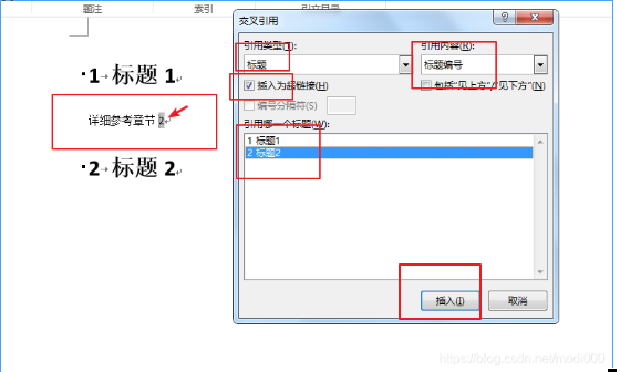 2)光标定位在要建立引用的地方,比如,置于详细参考章节后,依次选中如上图中交叉引用中的各项,此时详细参考章节多出了2,我们按住ctrl键点击此处的标题2,就会直接跳到下面的标题2处了。