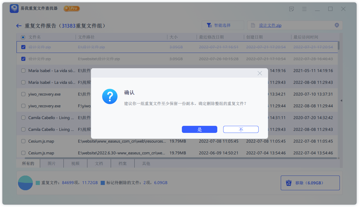 当选择一组所有的重复文件时,会出现“建议你一组重复文件至少保留一份副本。确定删除整组的重复文件?”的提示。